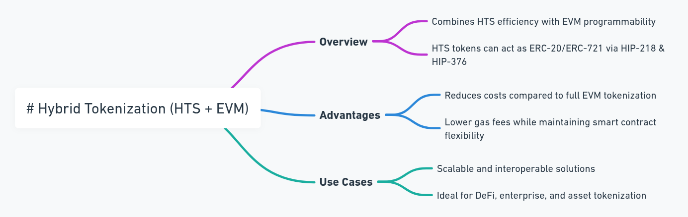 | Feature | HTS Native Tokenization | ERC/EVM Tokenization | Hybrid Tokenization |