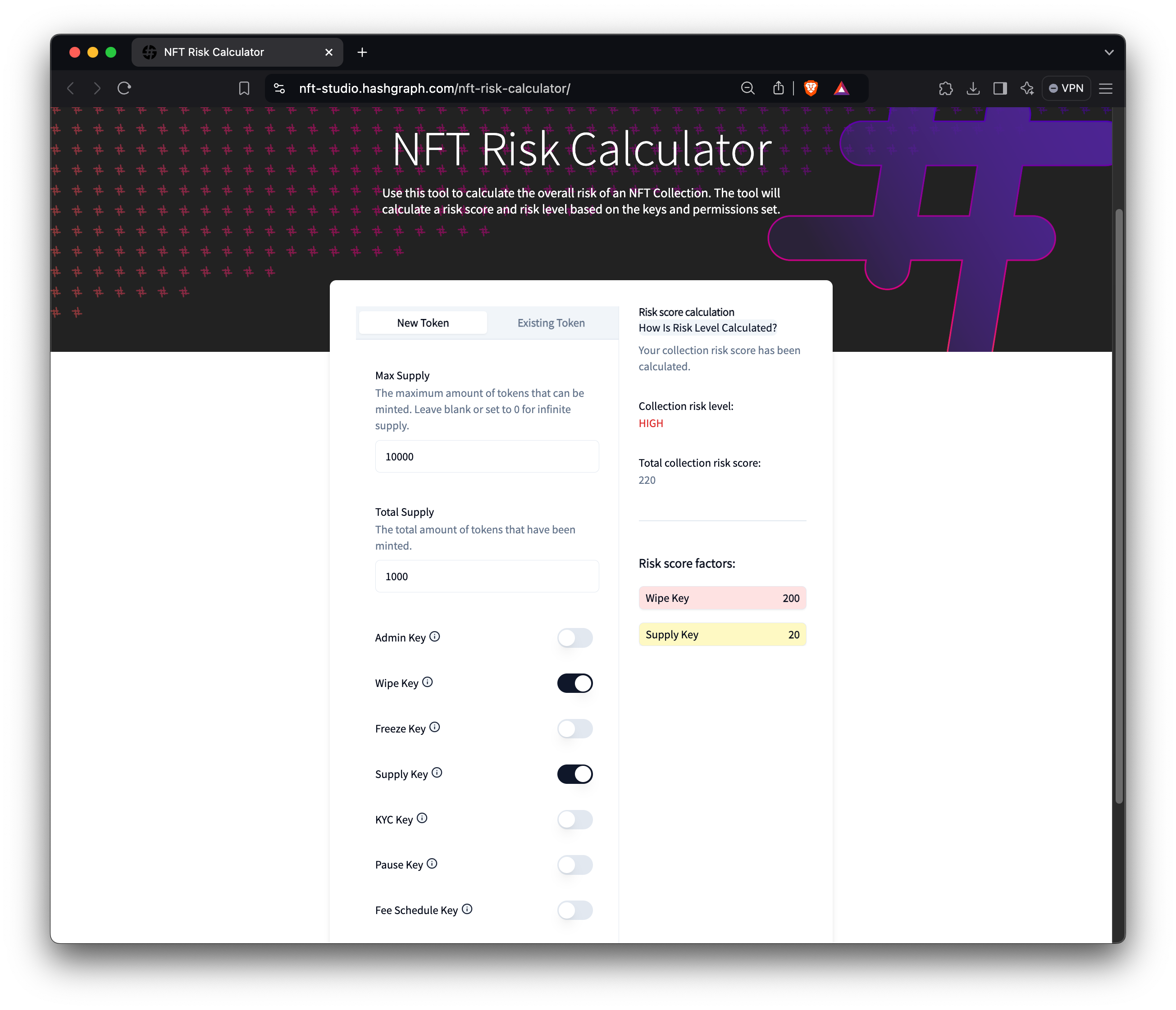 The NFT Risk Calculator evaluates the potential risk associated with tokens on the Hedera network, focusing on the likelihood of a “rug pull” based on specific token properties. The risk calculator generates a comprehensive risk score and risk level by analyzing key factors, such as the Admin Key, Supply Key, and KYC Key. The calculator can be used to assess both existing tokens and those you plan to create, gaining insights into how specific properties may make a collection more or less risky. This helps developers and token creators make informed decisions about token security and governance.