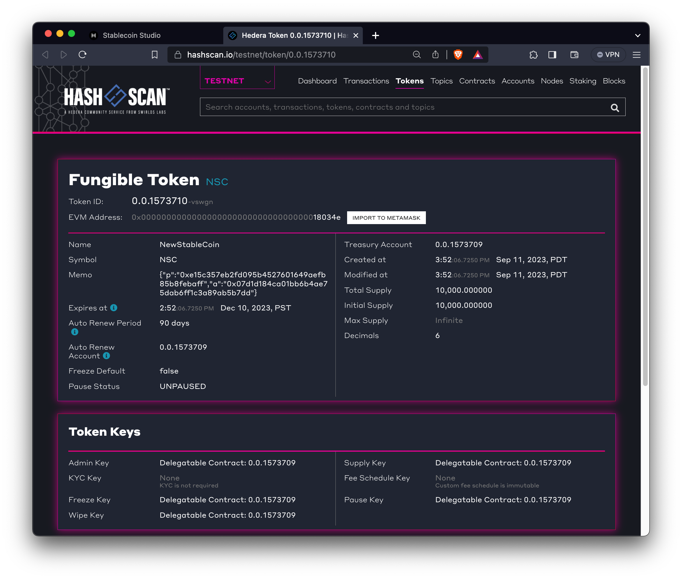This menu option displays stablecoin details and allows the user to update some token properties, like the name, symbol, and keys. Clicking on the pencil icon located at the top right side of the screen turns the information page into a form where these properties can be modified by the user. 🎉 Congrats on creating your first stablecoin with Stablecoin Studio! View the transaction details on HashScan by looking up your new token ID or clicking the HashScan Explorer link from the “Token ID” field.